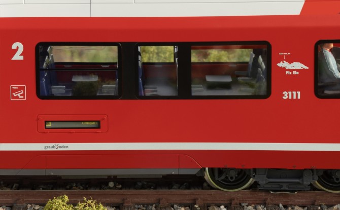 Modell des insgesamt vierteiligen Triebzuges der Baureihe ABe 4/16 „Capricorn“ der RhB setzt sich aus dem Trieb- und Steuerwagen (Art. 23100) sowie zwei Mittelwagen (Art. 33100/33150) zusammen. Originalgetreue Farbgebung und Beschriftung der Epoche VI. Angetrieben wird das Modell durch zwei kugelgelagerte Hochleistungsmotoren auf 4 Radsätze. Ausgerüstet mit einem mfx/DCC Decoder mit vielen Sound- und Lichtfunktionen wie mit der Fahrtrichtung wechselndem Spitzenlicht, Innenbeleuchtung sowie im Digitalbetrieb schaltbarer Beleuchtung der Zugzielanzeigen und des beleuchteten Wappens von Graubünden. Fahrgeräusch auch im Analogbetrieb funktionsfähig. Pantographen auf dem Triebwagen digital ferngesteuert heb- und senkbar. Das Modell besitzt viele angesetzte Details, wie Leitungen, Steckdosen, Scheibenwischer, Antennen und Rückspiegel.